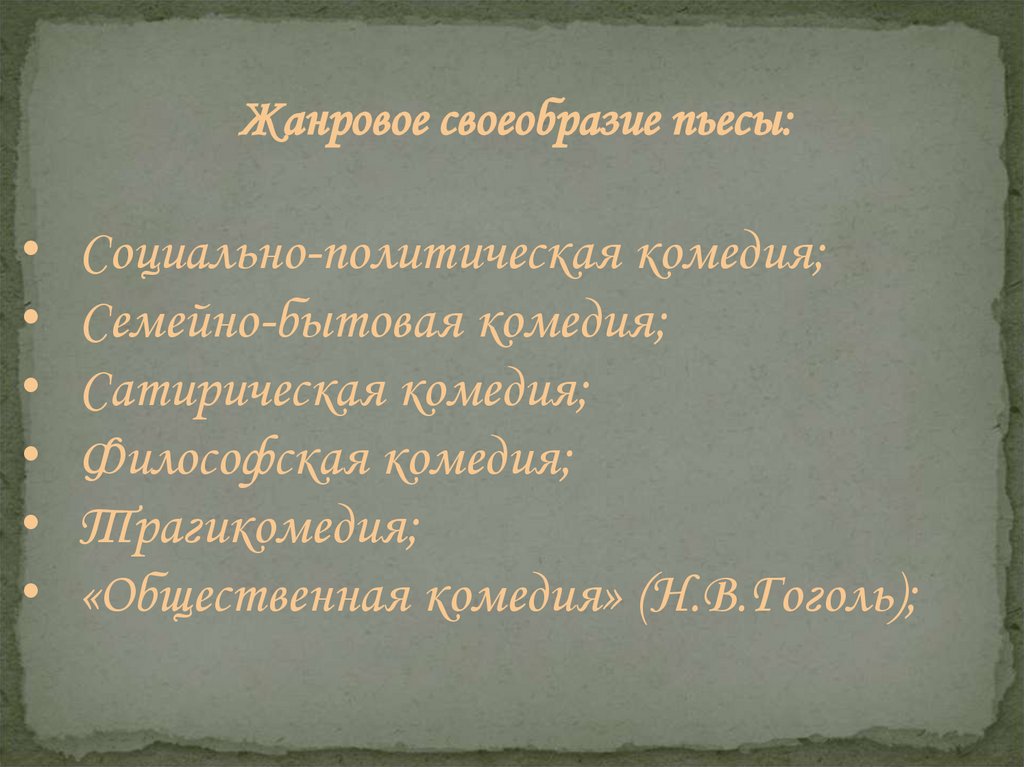 Жанровое своеобразие пьесы:• Социально-политическая комедия;