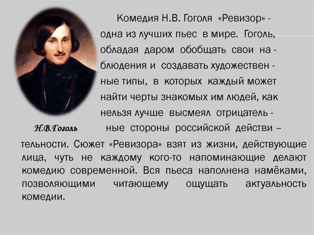Н.В.ГогольКомедия Н.В. Гоголя «Ревизор» одна из лучших пьес в мире. Гоголь,