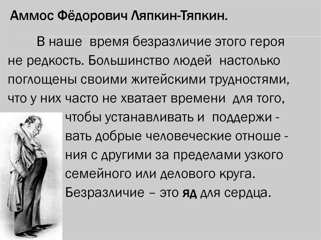 Аммос Фёдорович Ляпкин-Тяпкин.В наше время безразличие этого героя