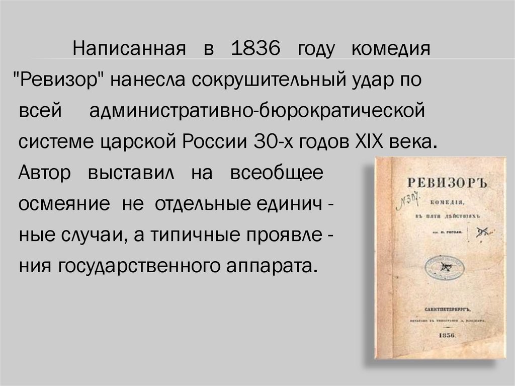 Написанная в 1836 году комедия"Ревизор" нанесла сокрушительный удар по