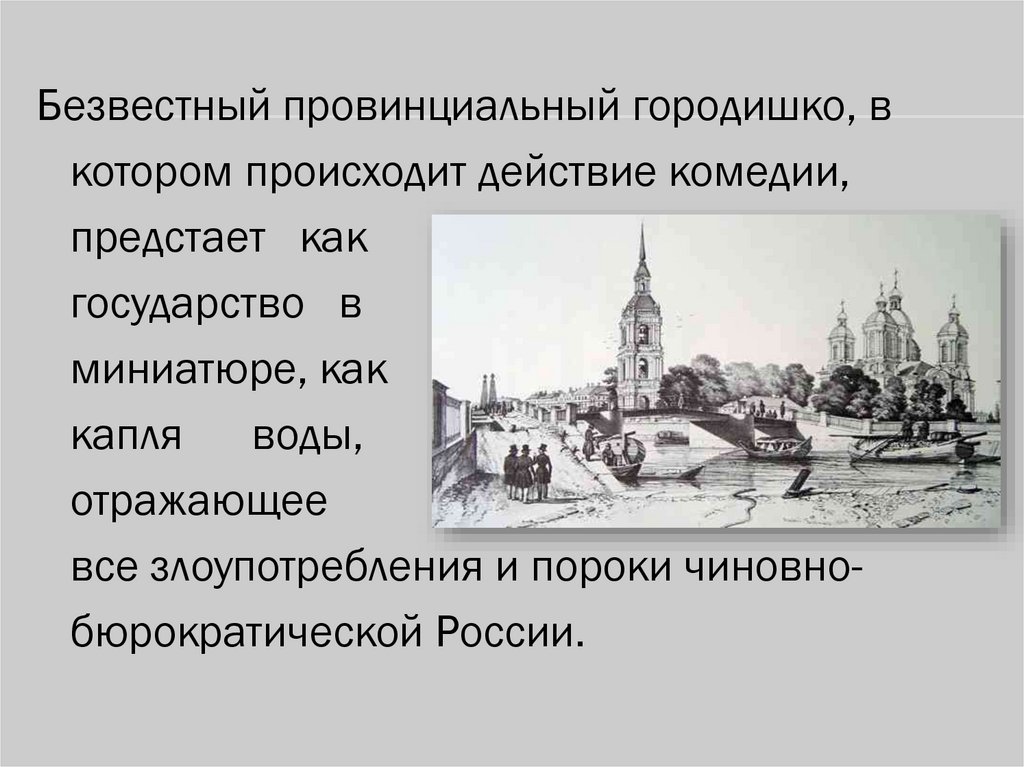 Безвестный провинциальный городишко, вкотором происходит действие комедии,