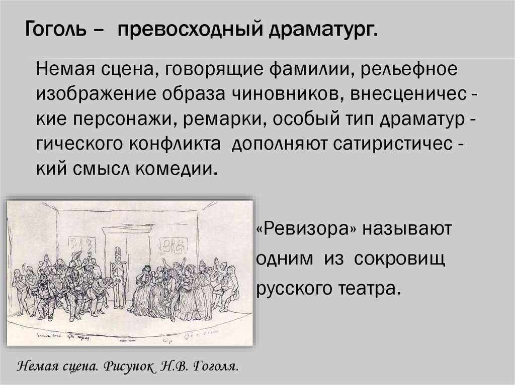 Гоголь – превосходный драматург.Немая сцена, говорящие фамилии, рельефное