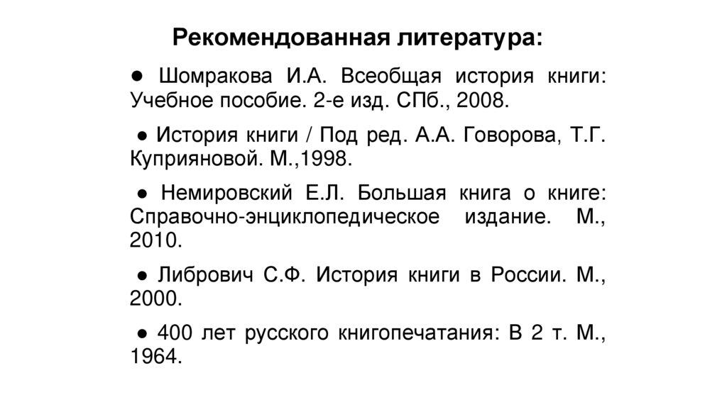Рекомендованная литература:● Шомракова И.А. Всеобщая история книги: