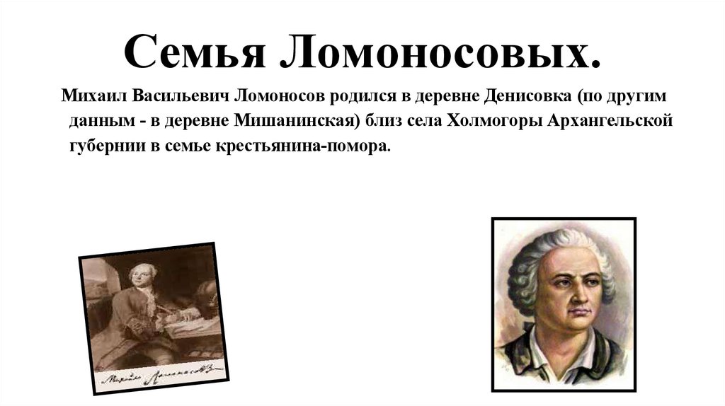 Семья Ломоносовых.Михаил Васильевич Ломоносов родился в деревне Денисовка (по другим