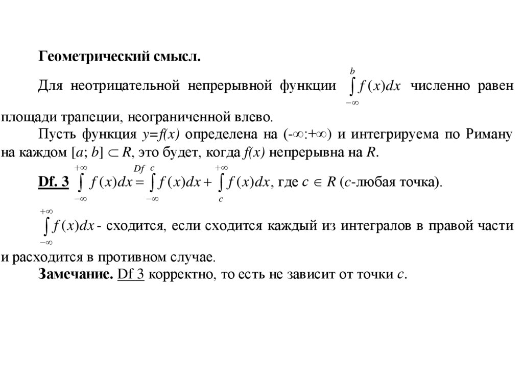 Геометрическая интерпретация:Для непрерывной и неотрицательной y=f(x) на (-∞: +∞) несобственный