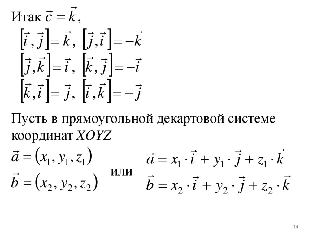 Теорема. Если a, b, c заданы в прямоугольнойдекартовой системе координат своими