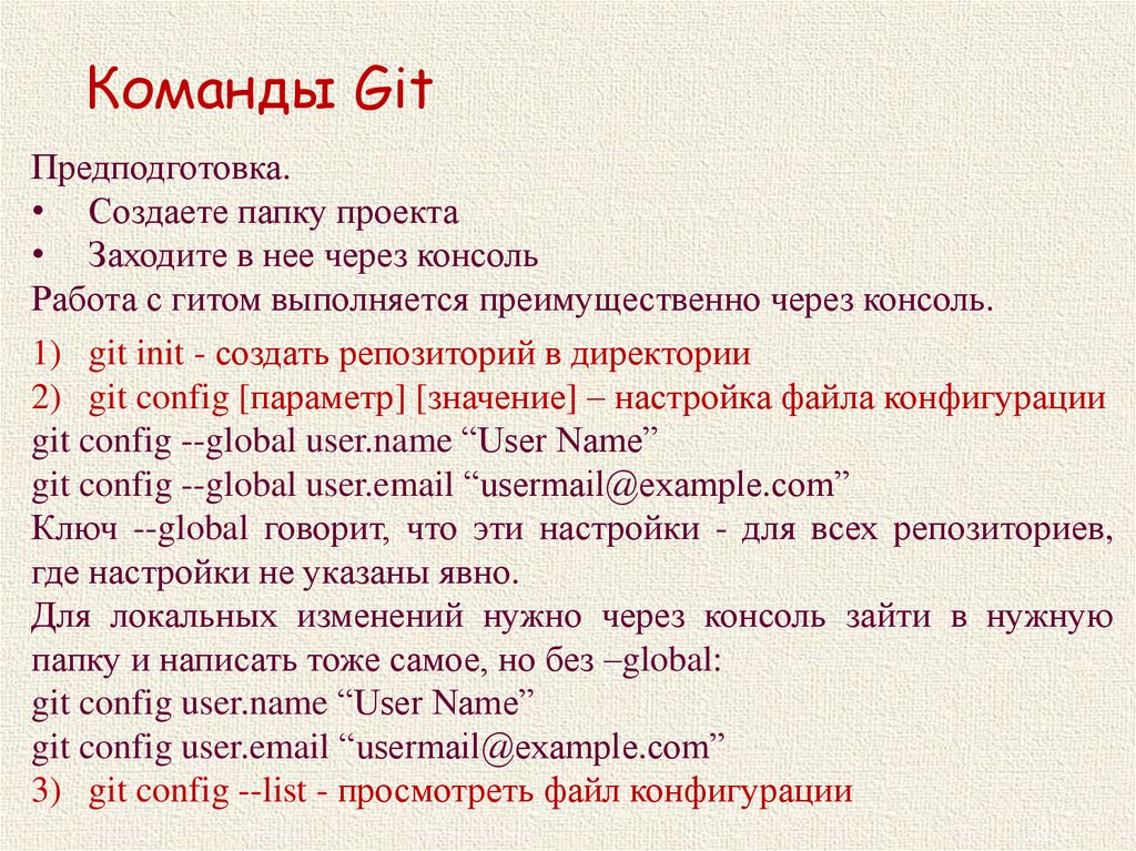 2) git config [параметр] [значение] – настройка файла конфигурации