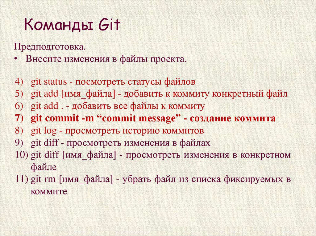 5) git add [имя_файла] - добавить к коммиту конкретный файл