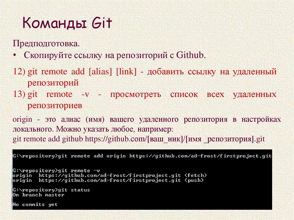 12) git remote add [alias] [link] - добавить ссылку на удаленный