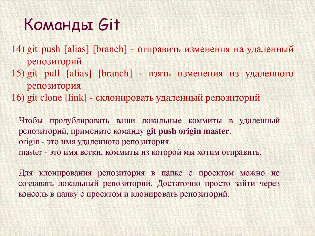 Команды Git14) git push [alias] [branch] - отправить изменения на удаленный