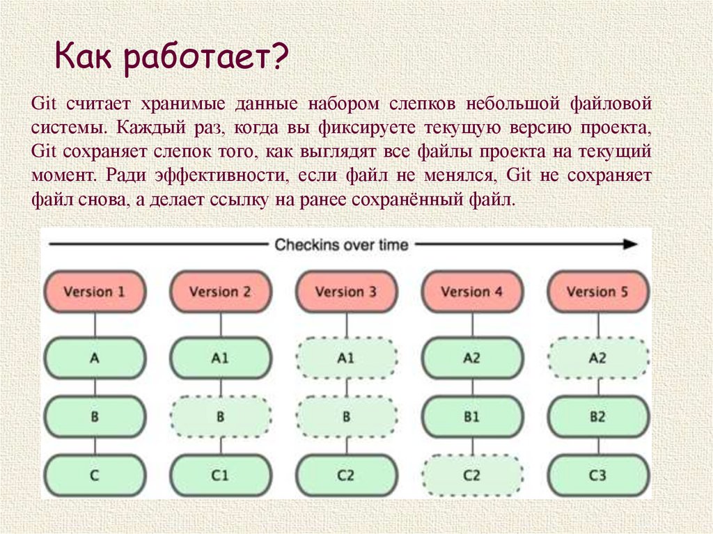 Как работает?Git считает хранимые данные набором слепков небольшой файловой