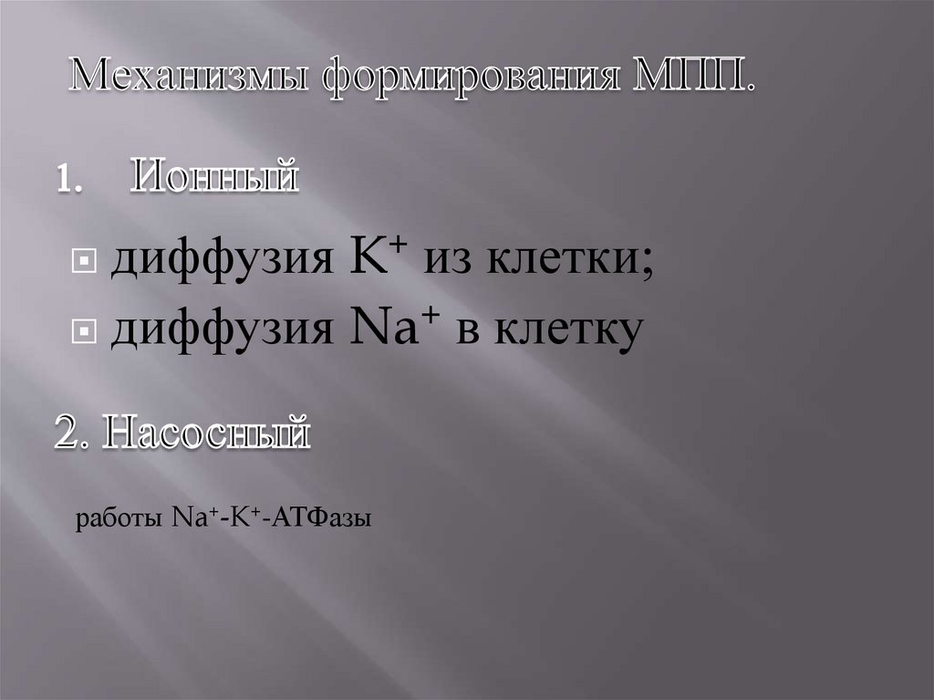 диффузия K+ из клетки;диффузия Na+ в клетку