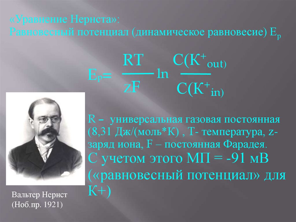 «Уравнение Нернста»:Равновесный потенциал (динамическое равновесие) Ер