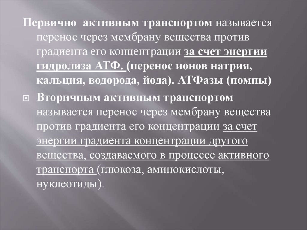 гидролиза АТФ. (перенос ионов натрия,