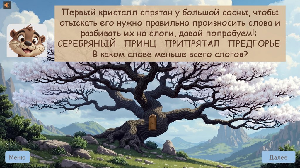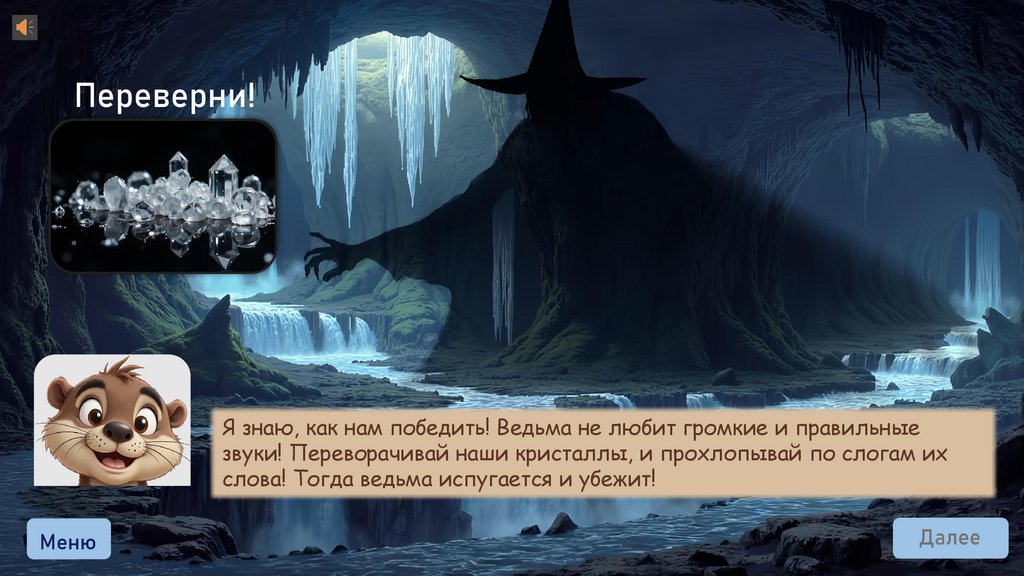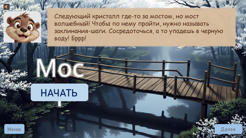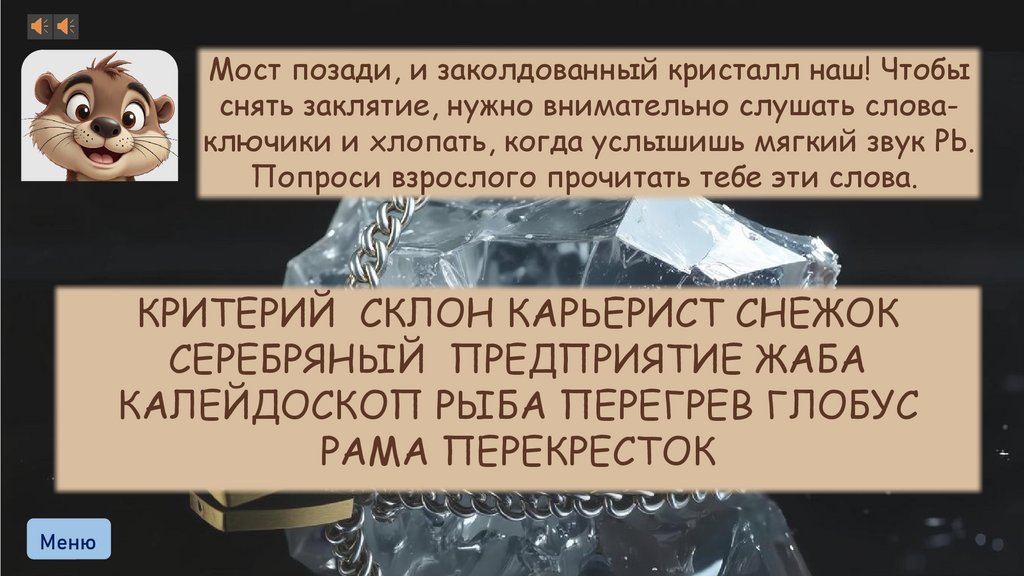Мост позади, и заколдованный кристалл наш! Чтобыснять заклятие, нужно внимательно слушать словаключики и хлопать, когда услышишь мягкий звук РЬ.