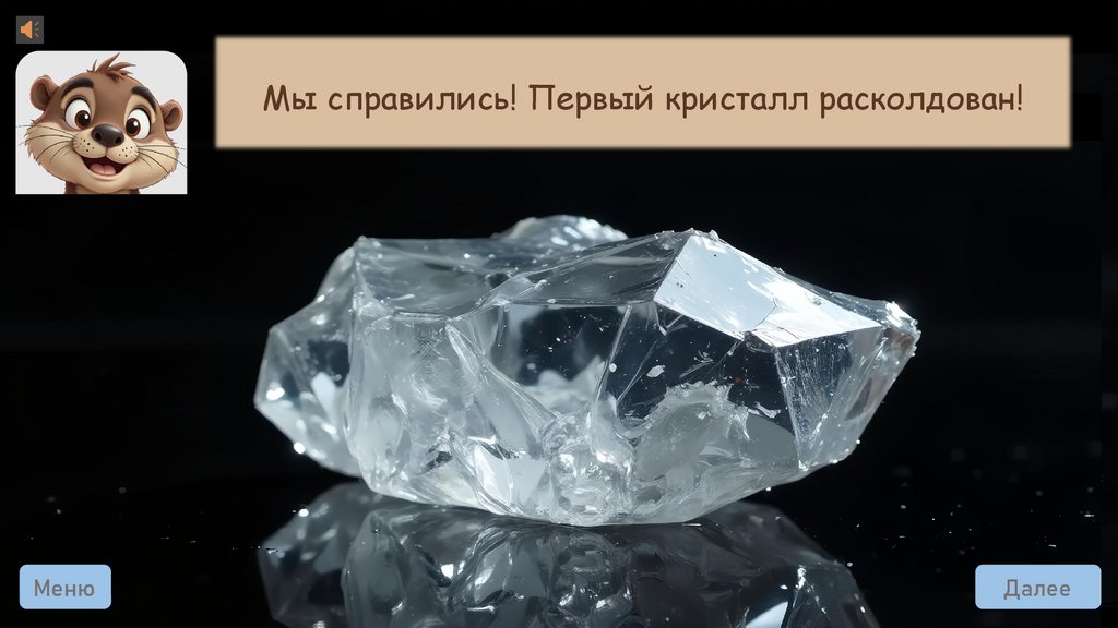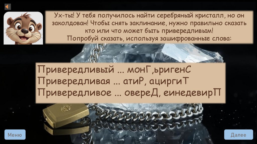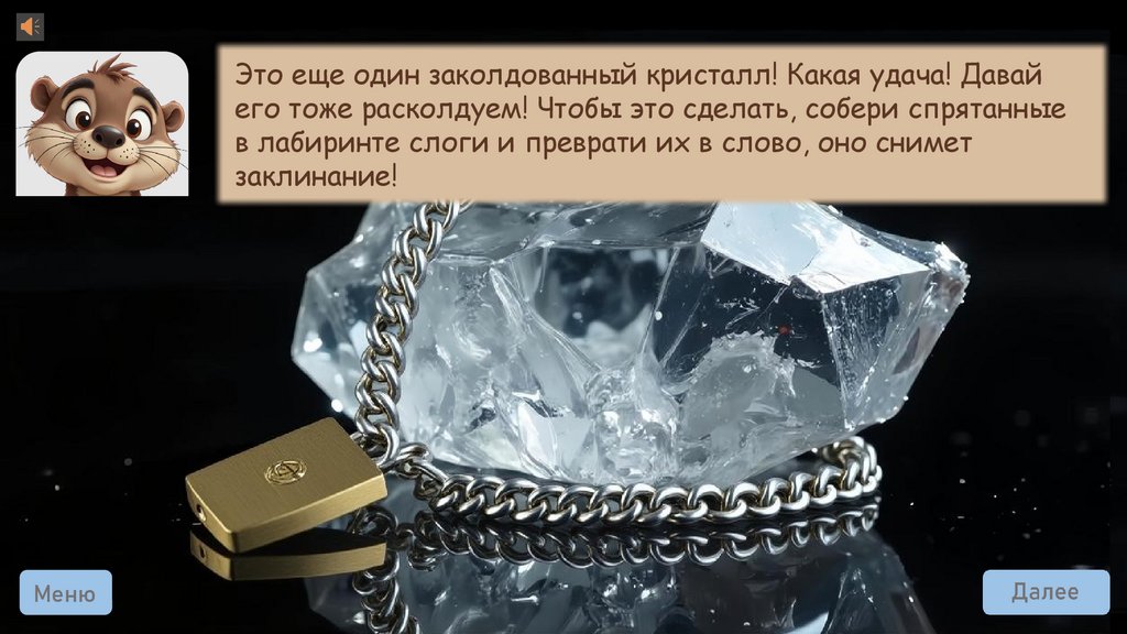 Ух-ты! У тебя получилось найти серебряный кристалл, но онзаколдован! Чтобы снять заклинание, нужно правильно сказать