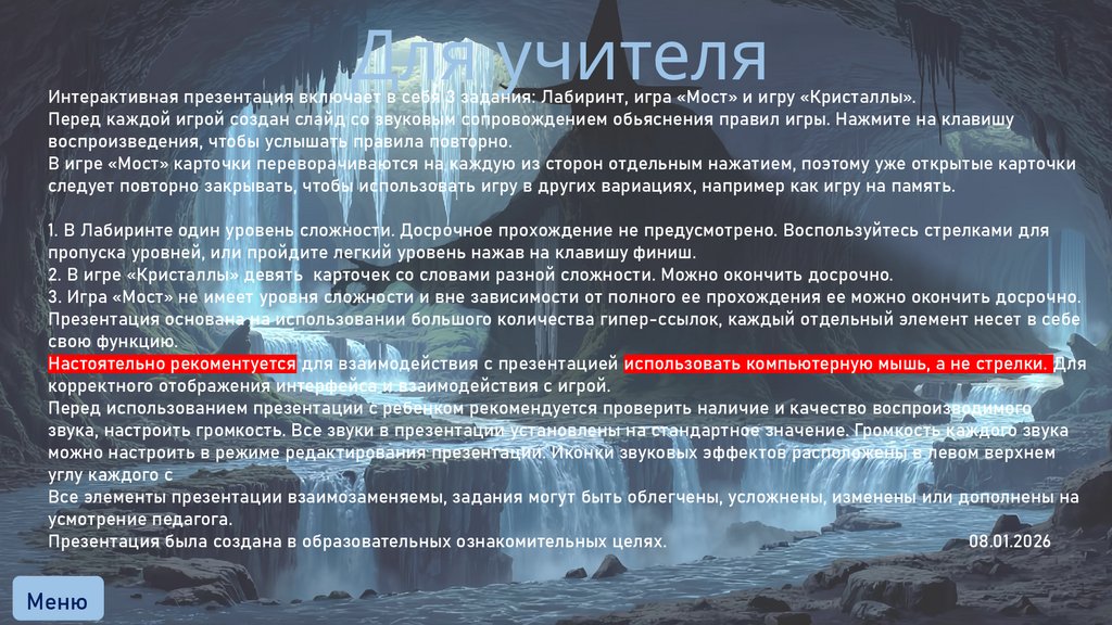 Для учителяИнтерактивная презентация включает в себя 3 задания: Лабиринт, игра «Мост» и игру «Кристаллы».