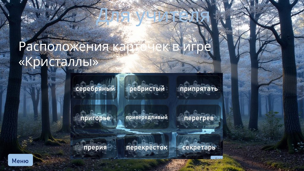 2. В игре «Кристаллы» девять карточек со словами разной сложности. Можно окончить досрочно.