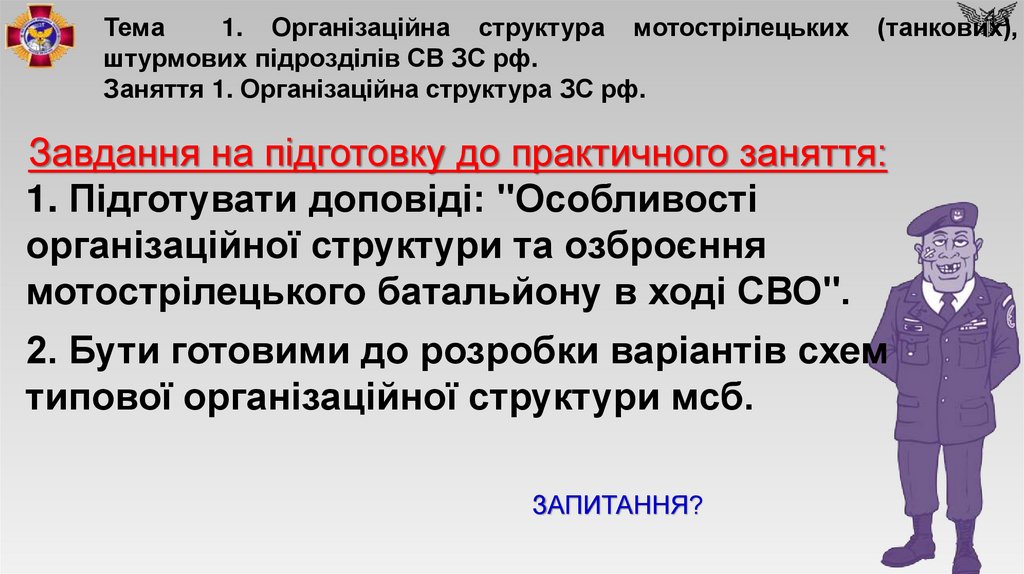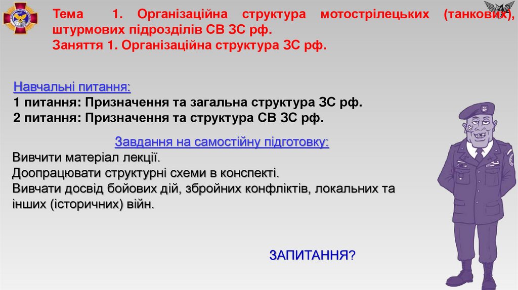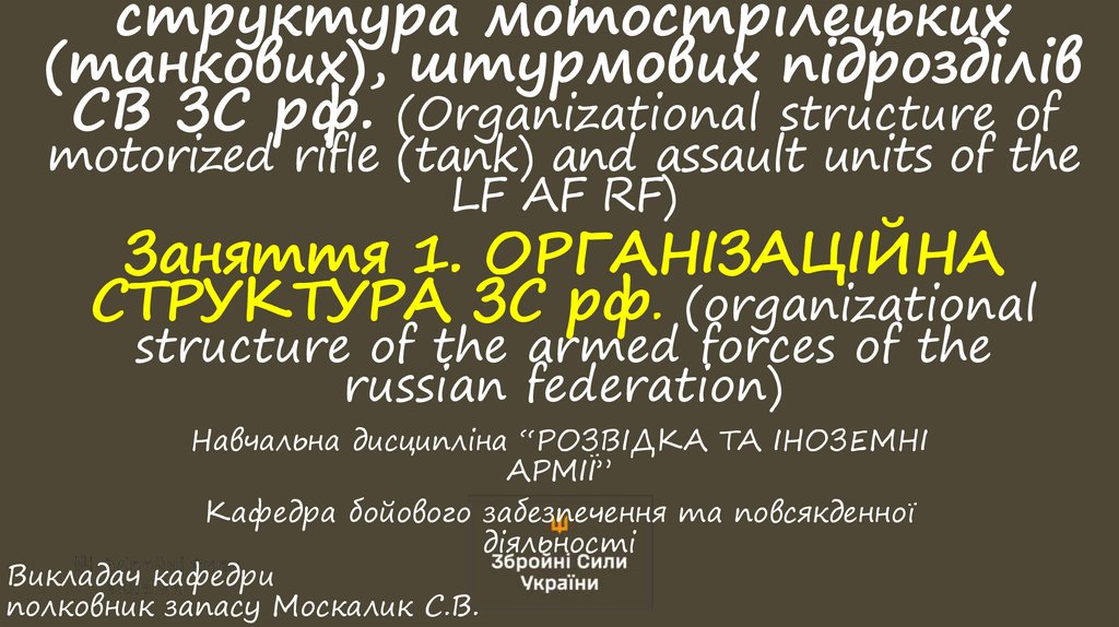 1. Лекція № 1 (Topic No. 1) Тема №1. Організаційна структура мотострілецьких (танкових), штурмових підрозділів СВ ЗС рф.
