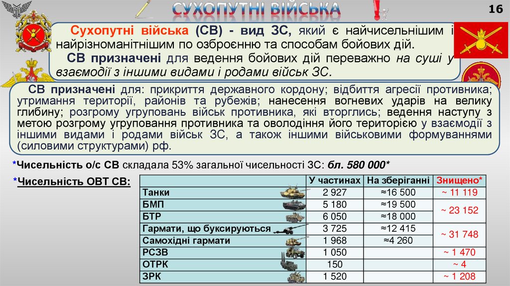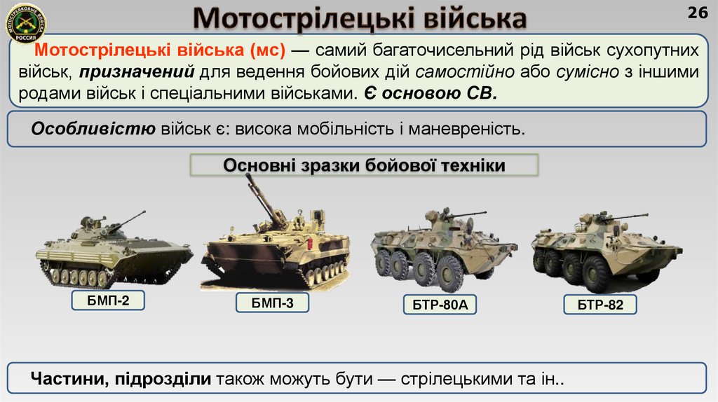 1) родів військ: мотострілецькі, танкові, ракетні війська і
