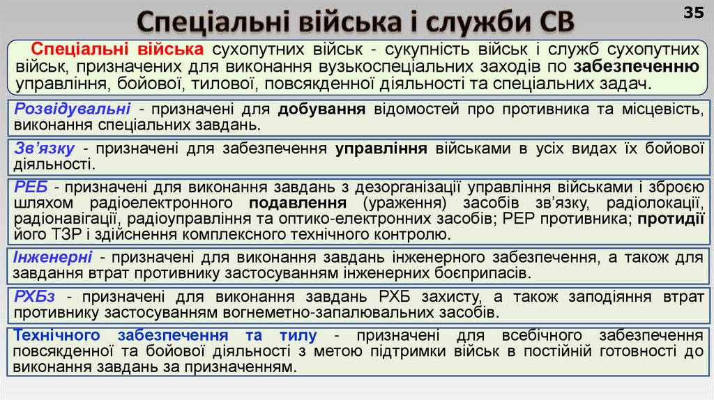 2) спеціальних військ: розвідувальні, зв'язку, РЕБ, інженерні,