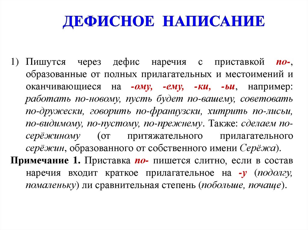 1) Пишутся через дефис наречия с приставкой по-,образованные от полных прилагательных и местоимений и