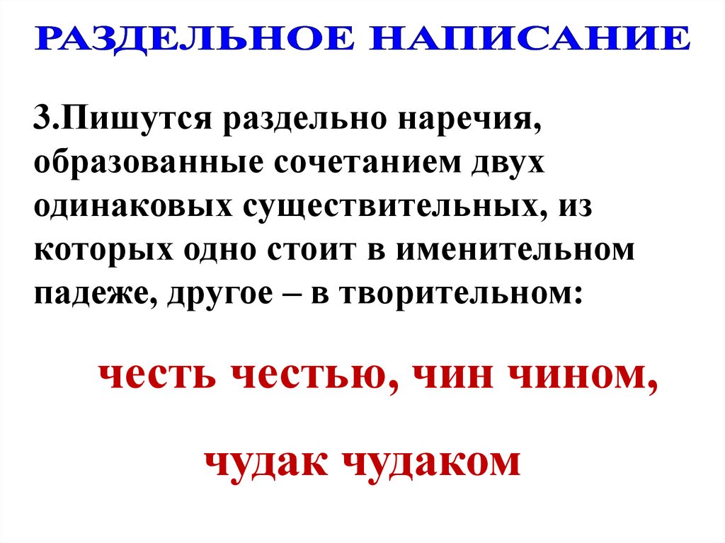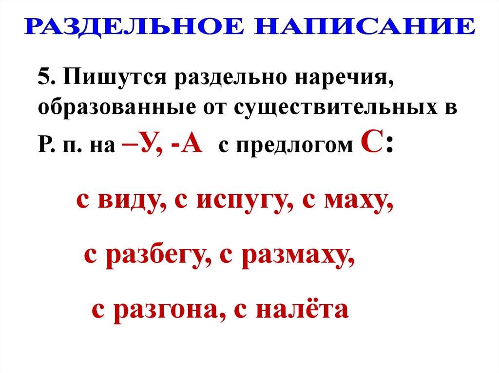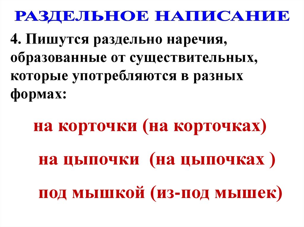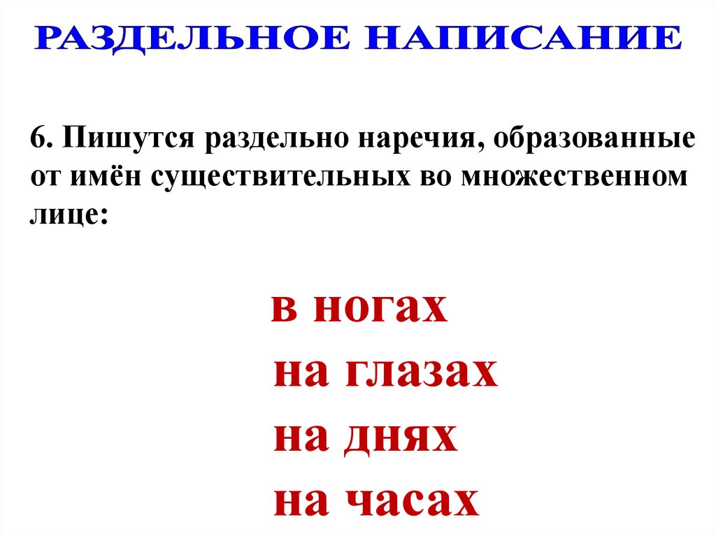 6. Пишутся раздельно наречия, образованныеот имён существительных во множественном