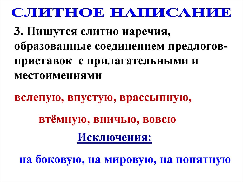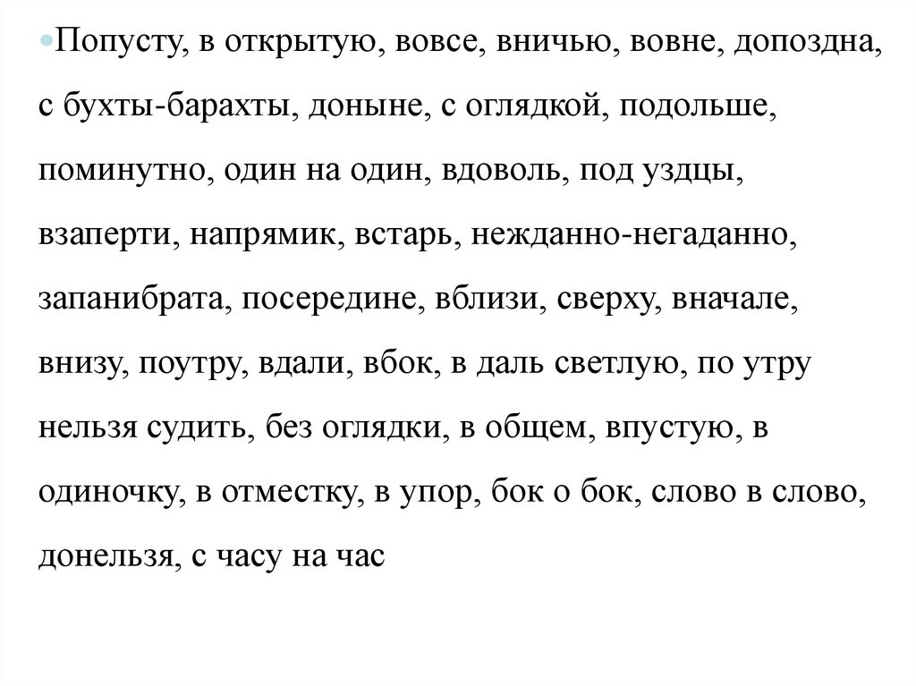 Попусту, в открытую, вовсе, вничью, вовне, допоздна,с бухты-барахты, доныне, с оглядкой, подольше,