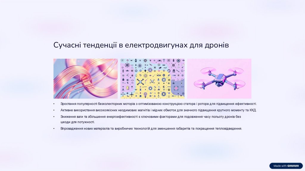 Сучасні тенденції в електродвигунах для дронівЗростання популярності безколекторних моторів з оптимізованою конструкцією статора і ротора для підвищення ефективності.