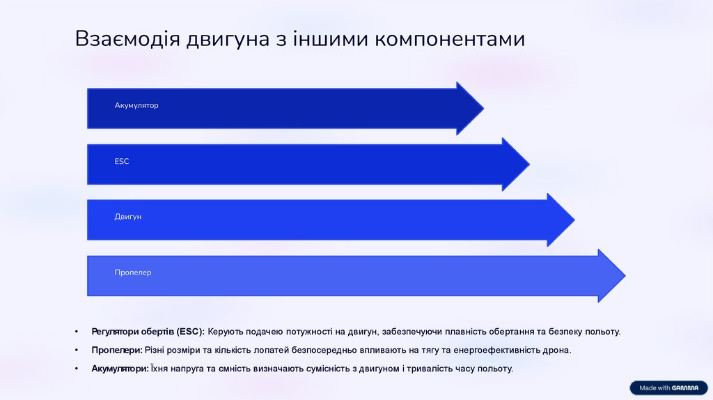 Регулятори обертів (ESC): Керують подачею потужності на двигун, забезпечуючи плавність обертання та безпеку польоту.