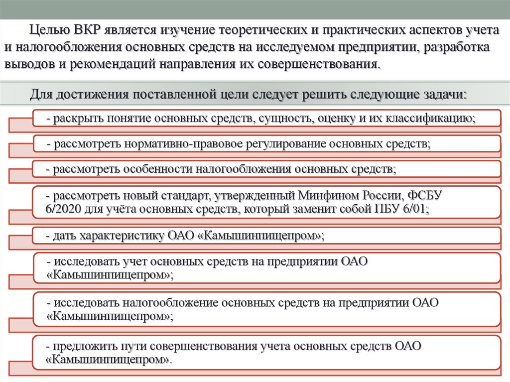 Целью ВКР является изучение теоретических и практических аспектов учетаи налогообложения основных средств на исследуемом предприятии, разработка