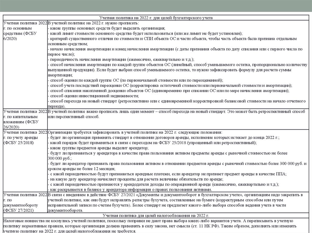Учетная политика на 2022 г. для целей бухгалтерского учетаУчетная политика 2022 В учетной политике на 2022 г. нужно прописать: