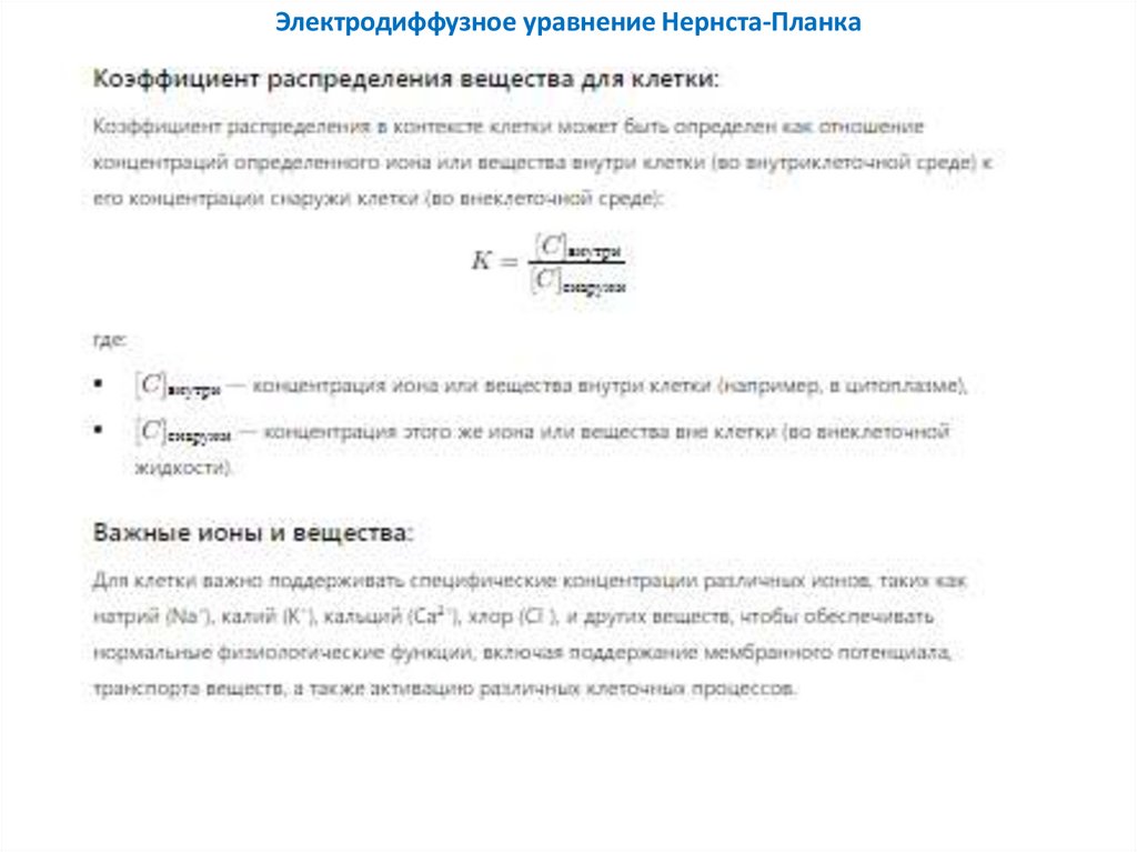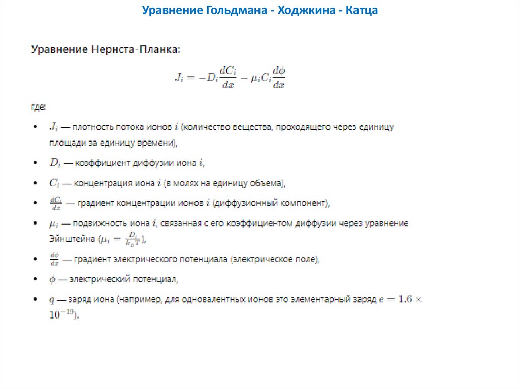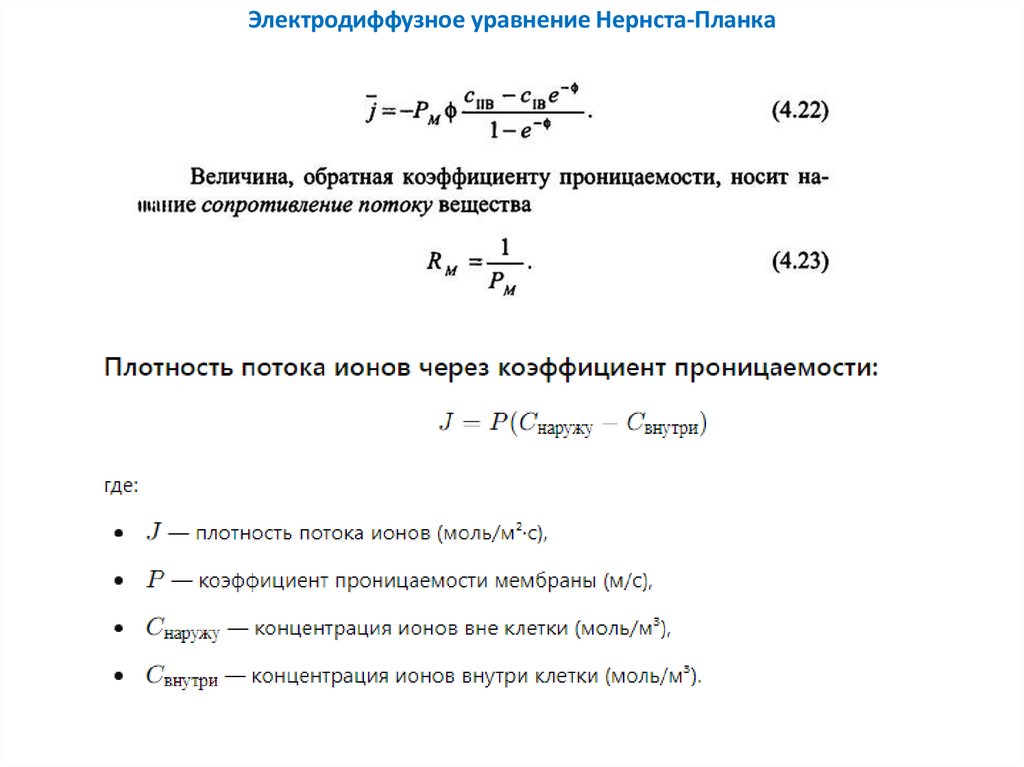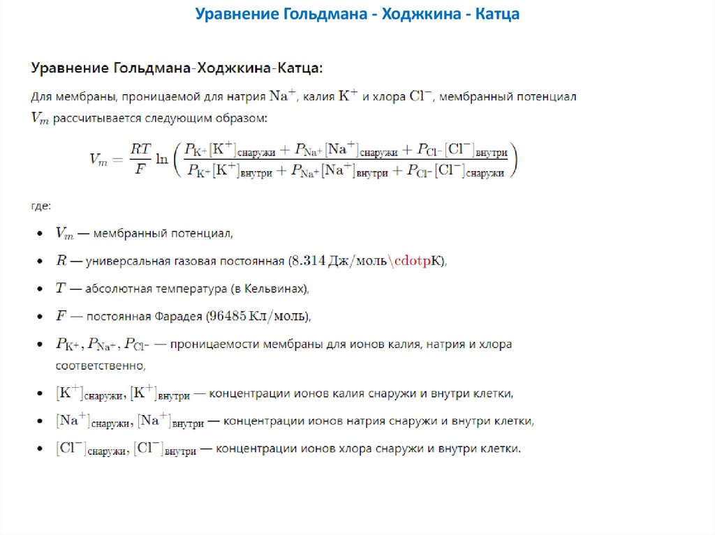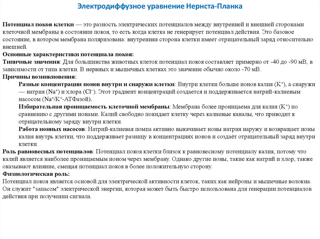 Электродиффузное уравнение Нернста-ПланкаПотенциал покоя клетки — это разность электрических потенциалов между внутренней и внешней сторонами