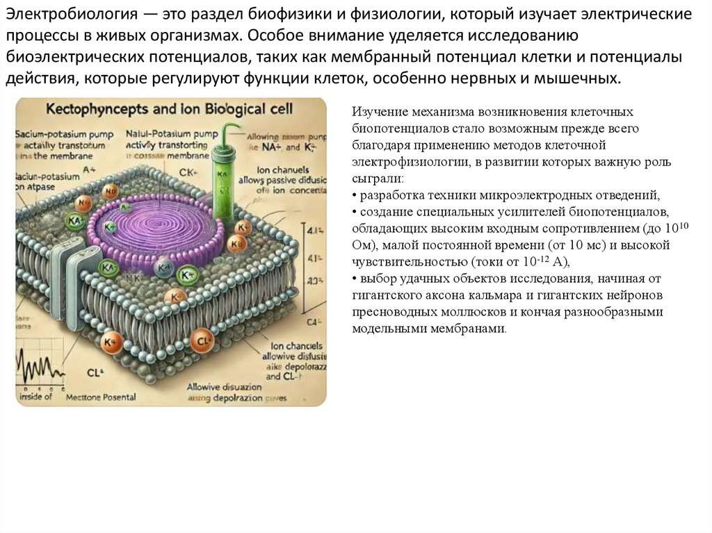 Электробиология — это раздел биофизики и физиологии, который изучает электрическиепроцессы в живых организмах. Особое внимание уделяется исследованию