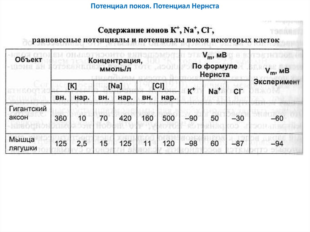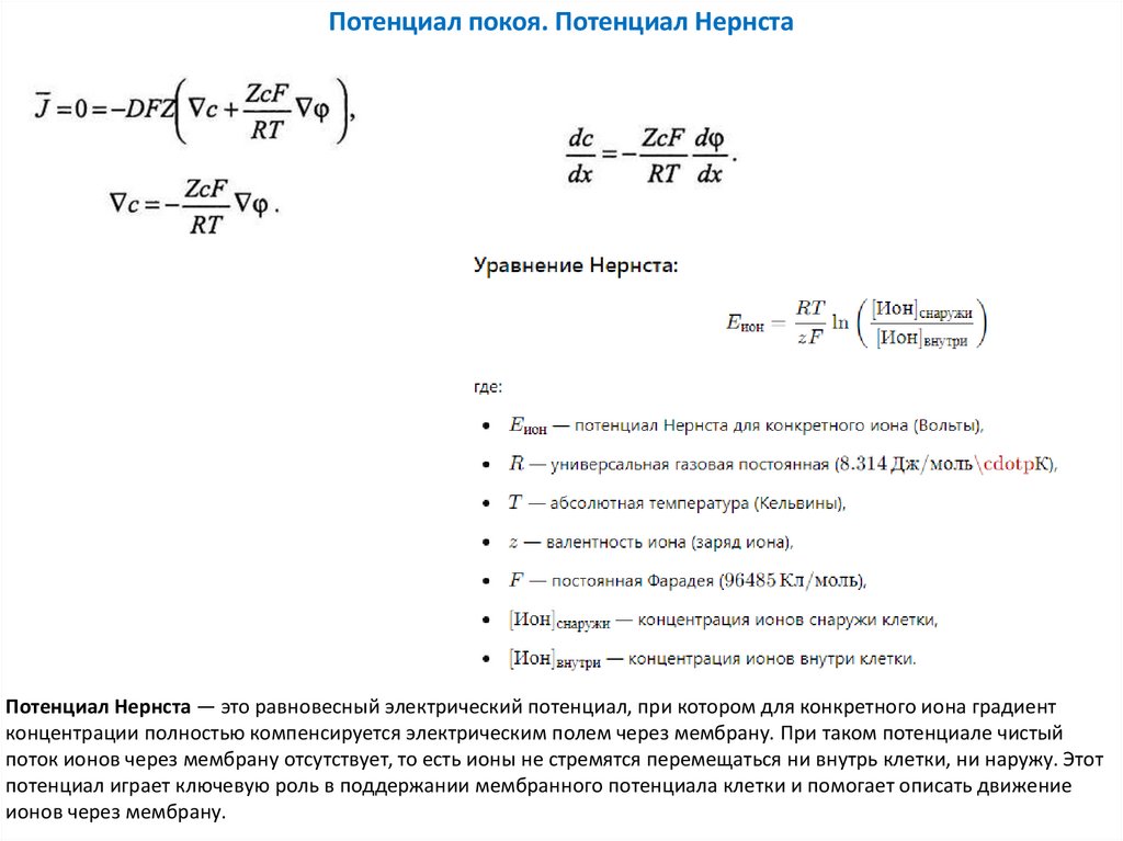 Потенциал покоя. Потенциал НернстаПотенциал Нернста — это равновесный электрический потенциал, при котором для конкретного иона градиент