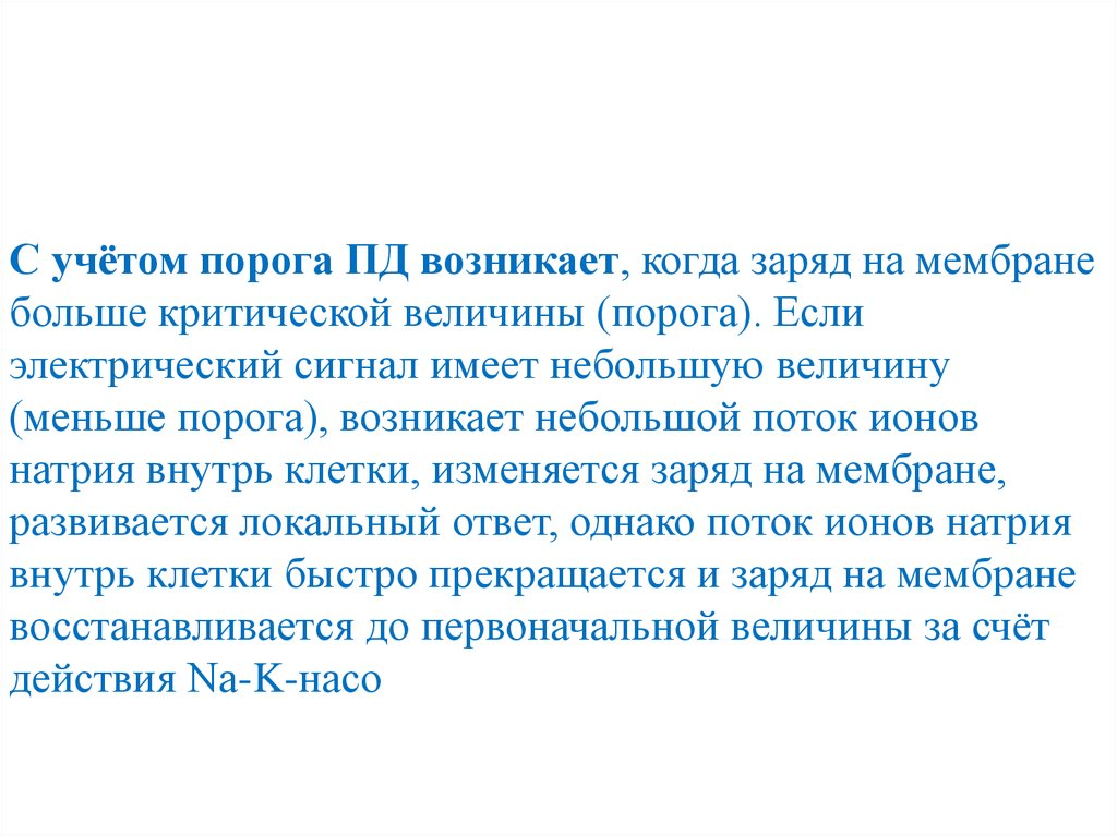 нарастает слишком медленно, мембрана клетки не сможет достичь порогового значения для генерации потенциала
