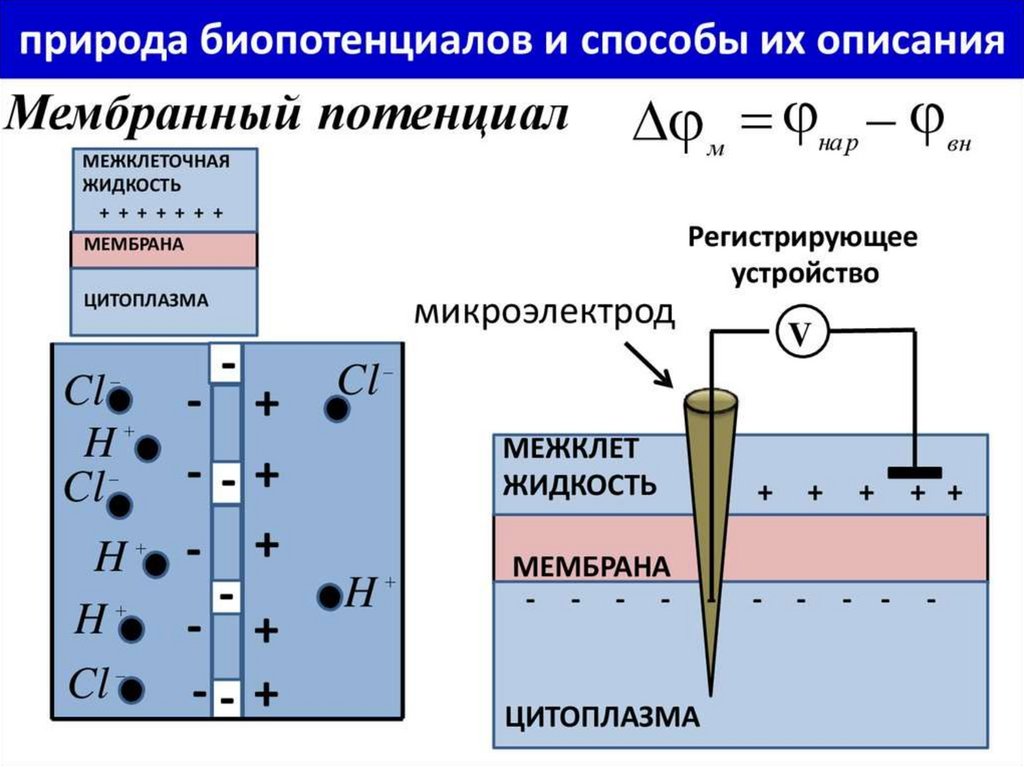 биоэлектрических потенциалов, таких как мембранный потенциал клетки и потенциалы