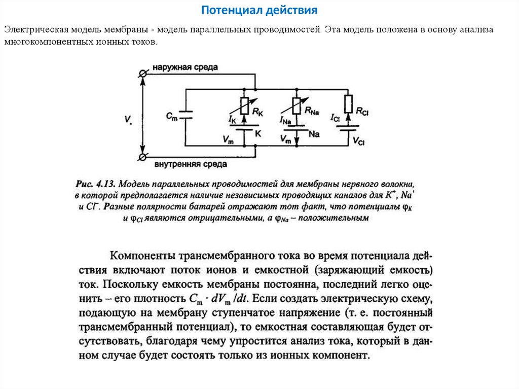 Потенциал действияЭлектрическая модель мембраны - модель параллельных проводимостей. Эта модель положена в основу анализа