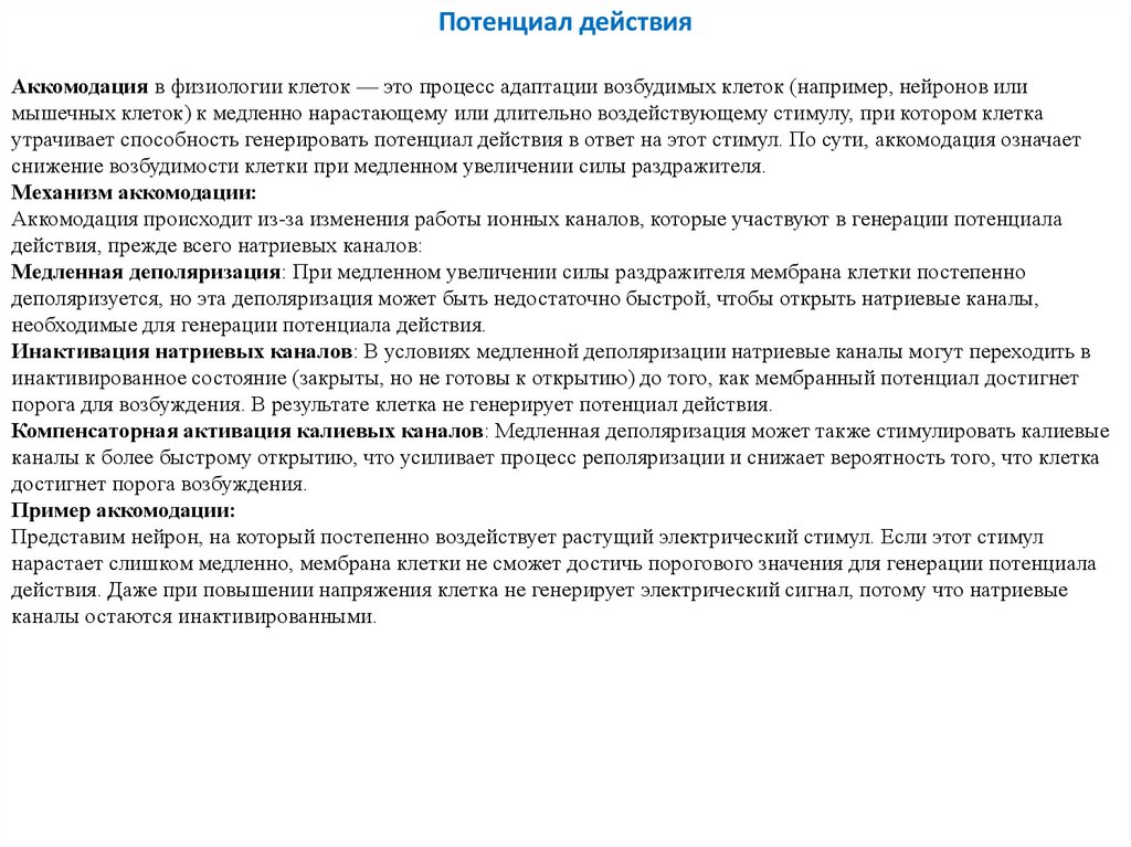 Потенциал действияАккомодация в физиологии клеток — это процесс адаптации возбудимых клеток (например, нейронов или