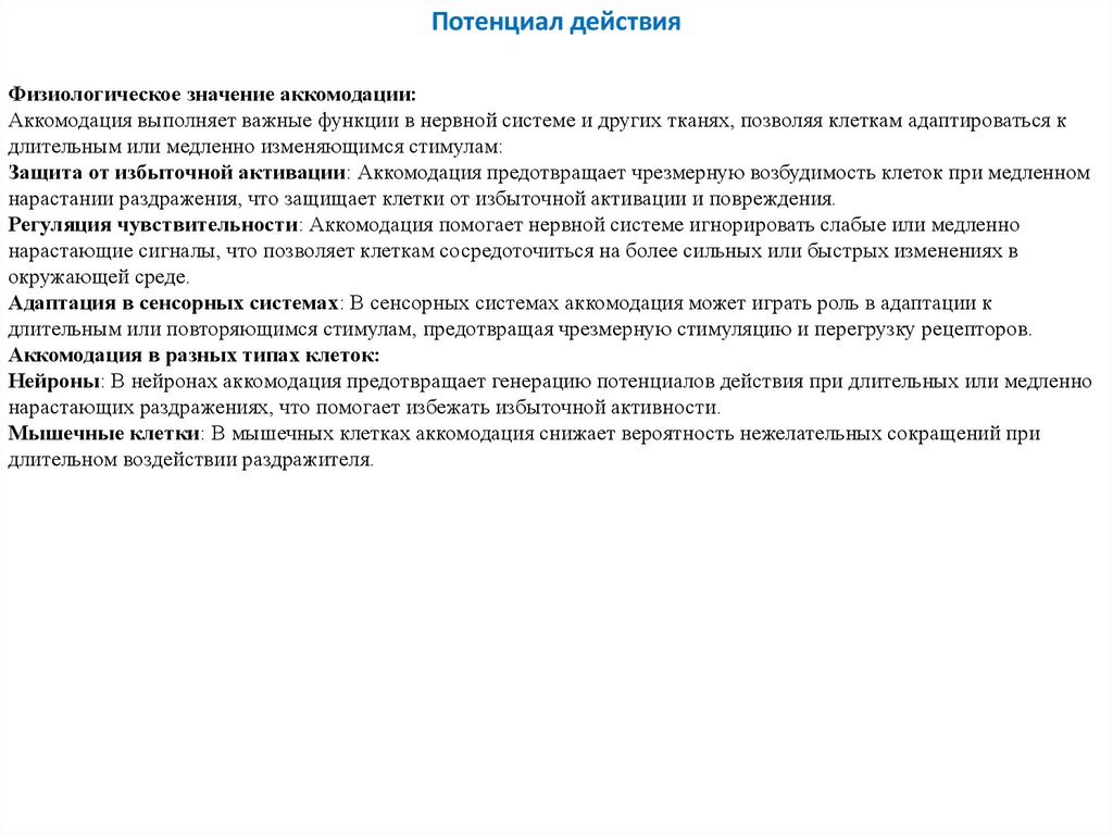 Аккомодация выполняет важные функции в нервной системе и других тканях, позволяя клеткам адаптироваться к