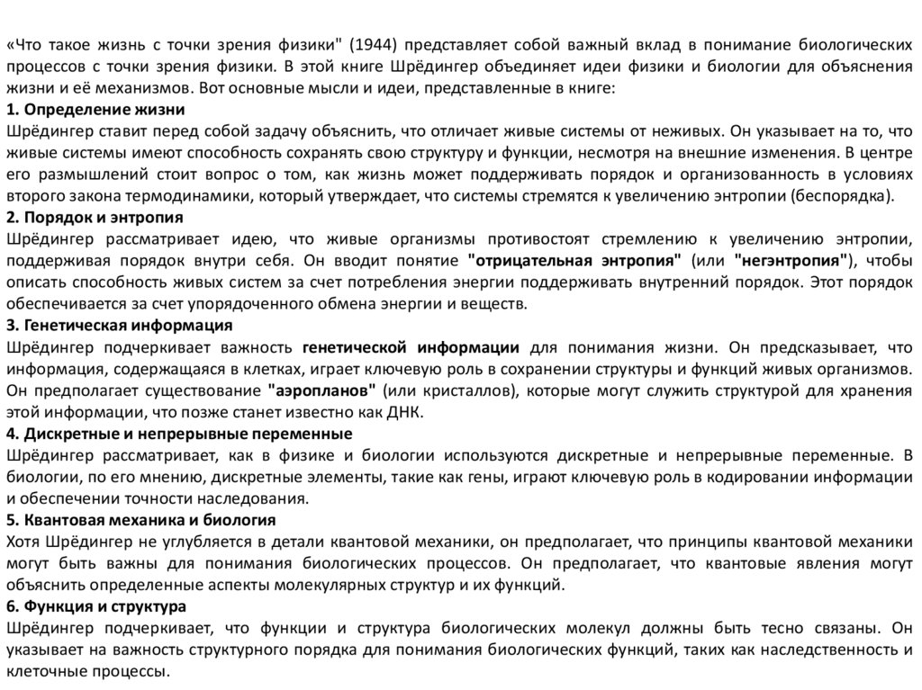 «Что такое жизнь с точки зрения физики" (1944) представляет собой важный вклад в понимание биологическихпроцессов с точки зрения физики. В этой книге Шрёдингер объединяет идеи физики и биологии для объяснения