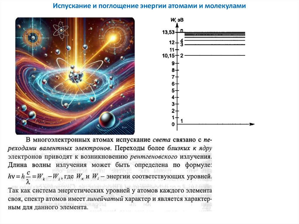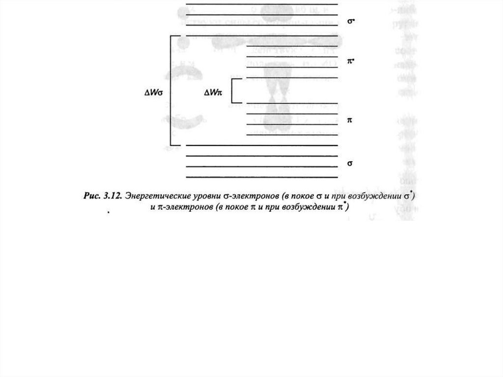 молекула поглощает или излучает свет (фотоны), электроны могут переходить между этими энергетическими