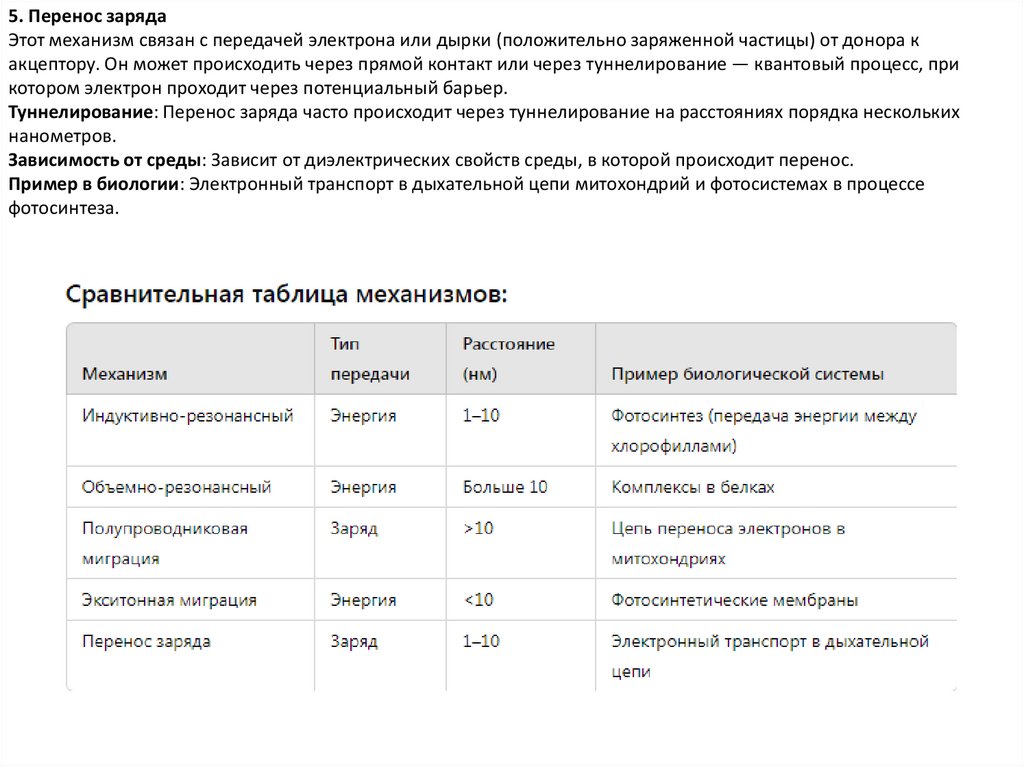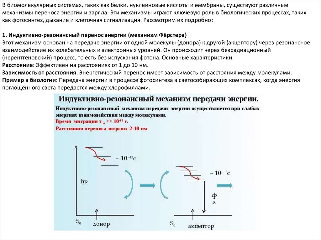 В биомолекулярных системах, таких как белки, нуклеиновые кислоты и мембраны, существуют различныемеханизмы переноса энергии и заряда. Эти механизмы играют ключевую роль в биологических процессах, таких