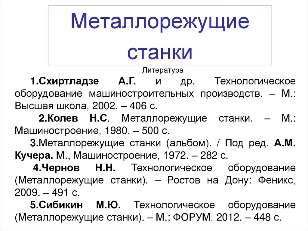 (Металлорежущие станки). – М.: ФОРУМ, 2012. – 448 с.