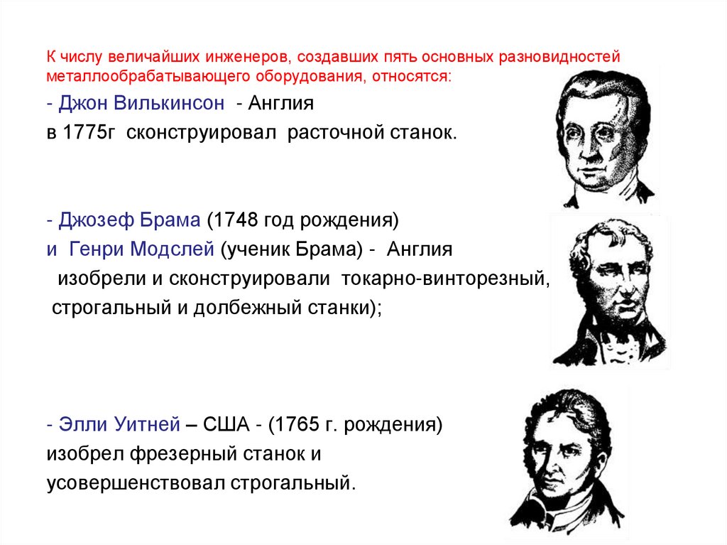 К числу величайших инженеров, создавших пять основных разновидностейметаллообрабатывающего оборудования, относятся: