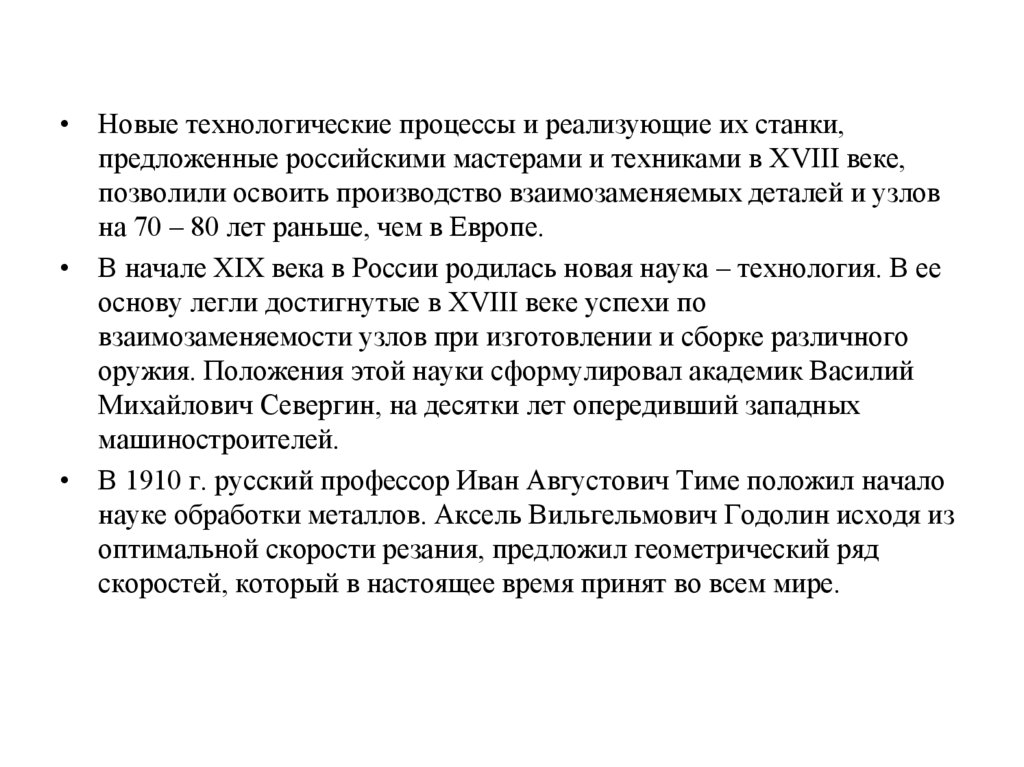• Новые технологические процессы и реализующие их станки,предложенные российскими мастерами и техниками в XVIII веке,