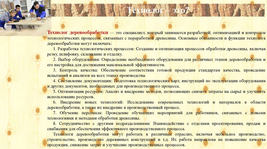 Технолог – это?Технолог деревообработки — это специалист, который занимается разработкой, оптимизацией и контролем
