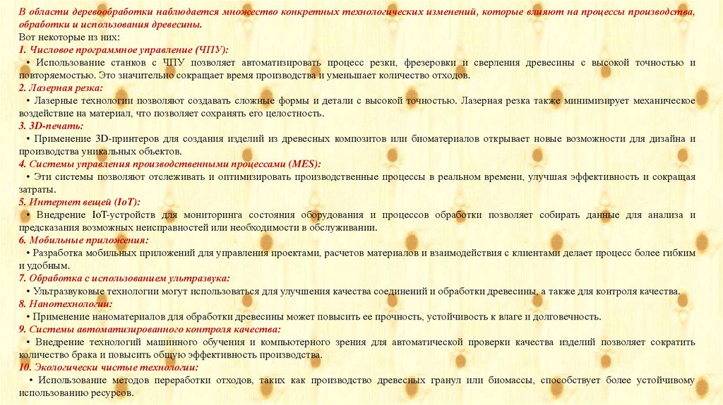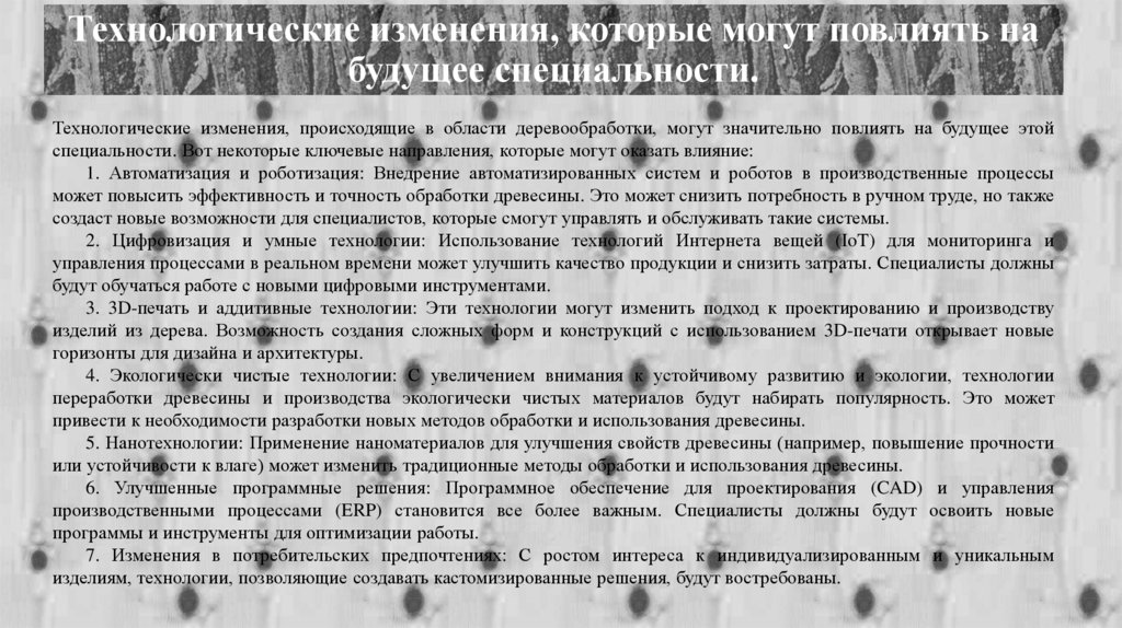 Технология деревообработки продолжает развиваться, адаптируясь к современнымтребованиям рынка и экологическим стандартам. Инновации в этой области открывают новые