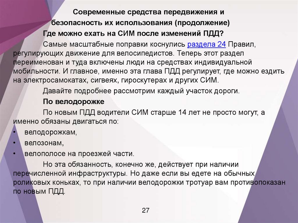 в отсутствии велодорожки СИМ могут переезжать или переходить