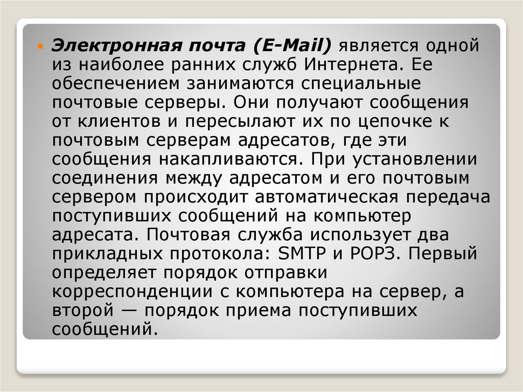 Электронная почта (E-Mail) является однойиз наиболее ранних служб Интернета. Ее